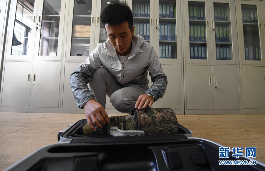 6月3日,李學(xué)明在整理設(shè)備,準(zhǔn)備開(kāi)始當(dāng)天的巡護(hù)監(jiān)測(cè)工作。新華社記者馮開(kāi)華攝。