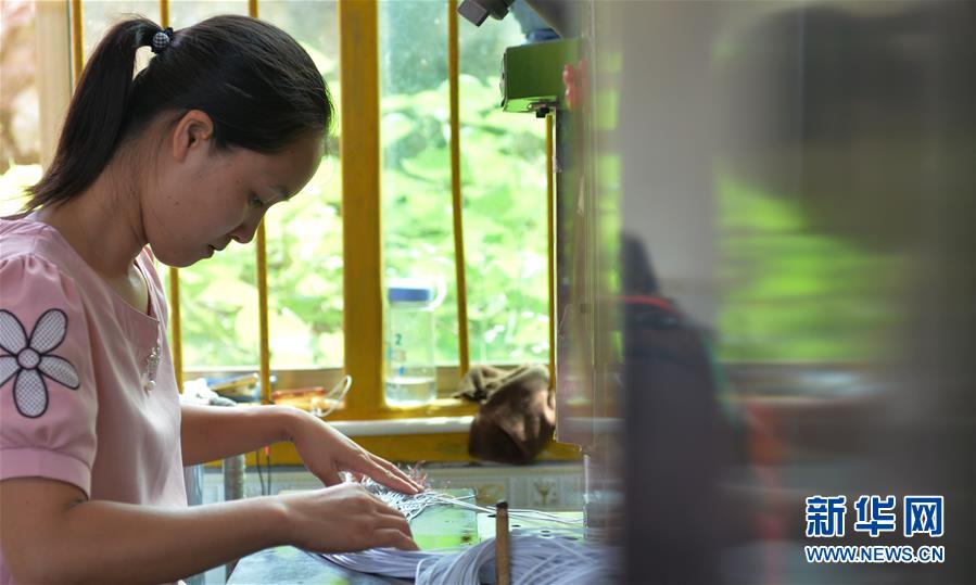6月4日,一名女工在永州市新田縣一處易地搬遷集中安置點的扶貧車間里加工電器零部件。新華社記者趙眾志攝。