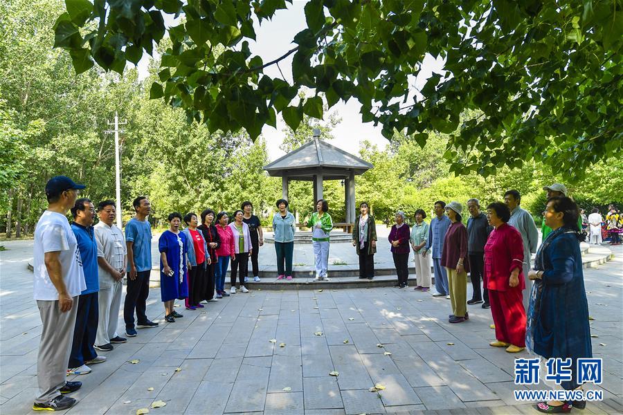 6月5日,市民在文安縣水景公園內練習合唱。近年來,河北省文安縣將植樹造林與城市建設有機融合,探索“政府引導、企業(yè)運作、多方共贏”的市場化植樹造林新模式,大規(guī)模推進國土綠化,打造人與自然和諧共生的優(yōu)美生態(tài)環(huán)境,構筑京津雄綠色屏障。截至目前,該縣森林覆蓋率已經(jīng)達到33%,城區(qū)綠地面積達到36.48%。新華社記者李曉果攝。