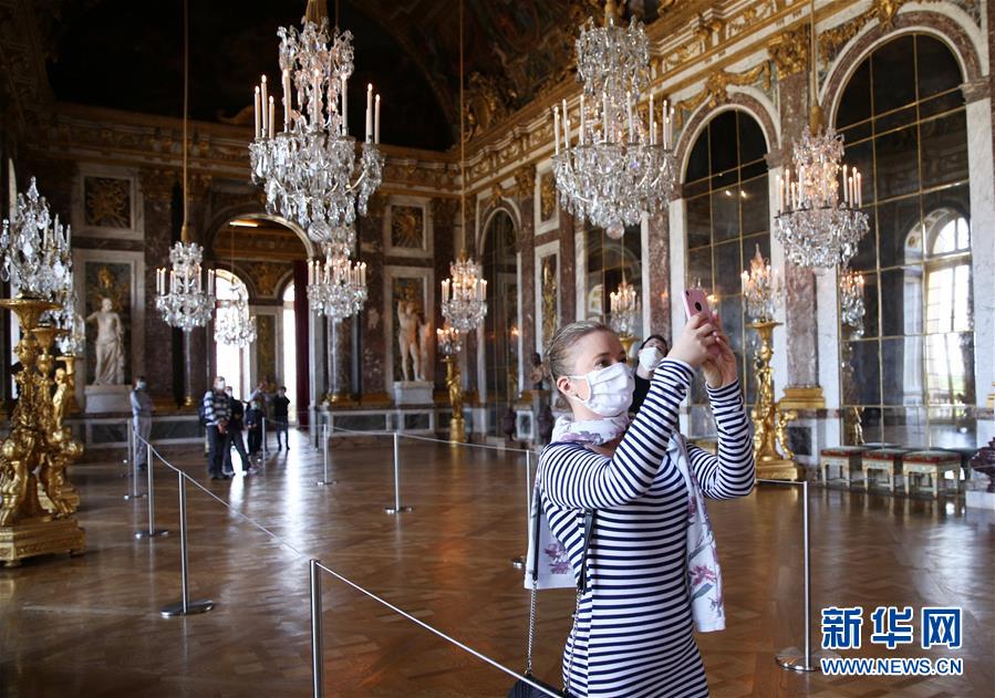 6月6日,一名游客戴著口罩在法國巴黎近郊凡爾賽宮的鏡廳內(nèi)參觀游覽。 新華社記者 高靜 攝