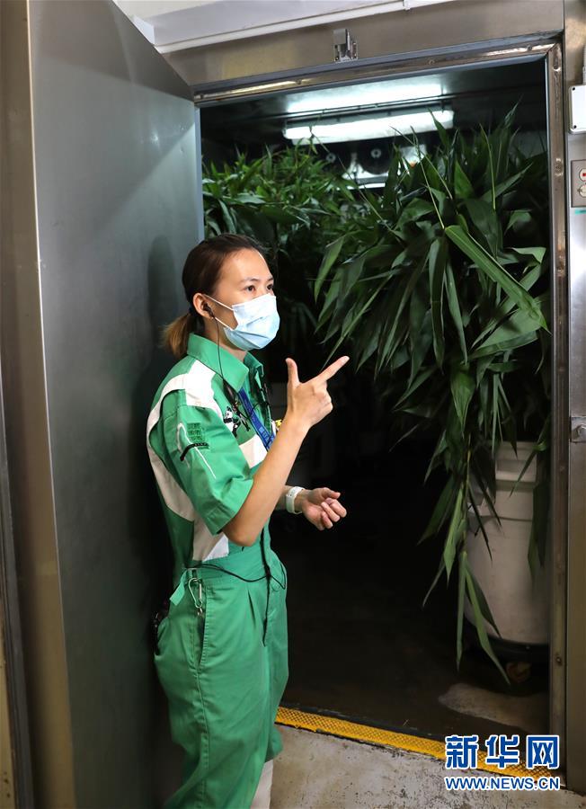 香港海洋公園陸生動物部監(jiān)督殷漫萍介紹熊貓食物竹子的儲存(5月11日攝)。新華社記者吳曉初攝