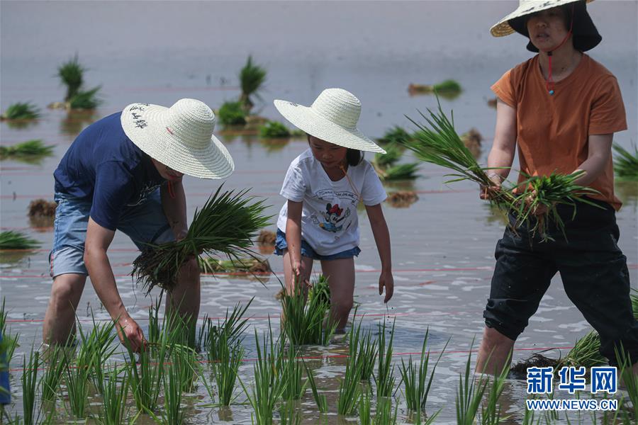 6月7日,孩子和家長在稻田里插秧。