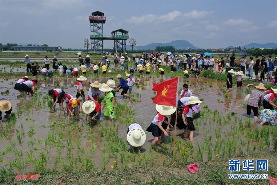 6月7日,孩子和家長(zhǎng)在稻田里插秧。