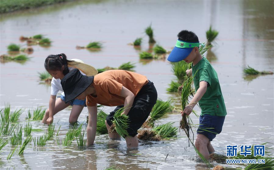 6月7日,孩子和家長(zhǎng)體驗(yàn)稻田插秧。新華社記者徐昱攝