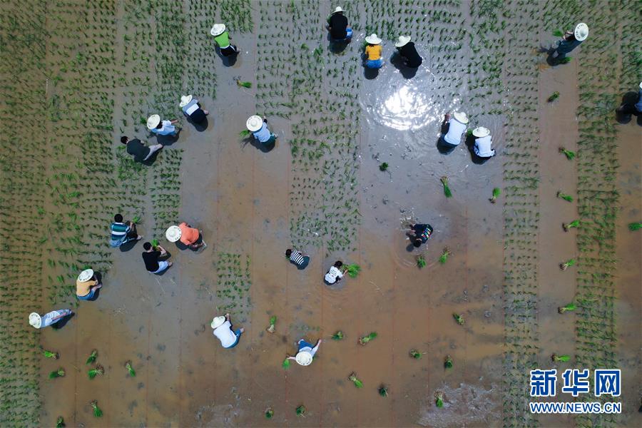 6月7日,孩子和家長(zhǎng)們?cè)隗w驗(yàn)稻田插秧(無人機(jī)照片)。新華社記者徐昱攝
