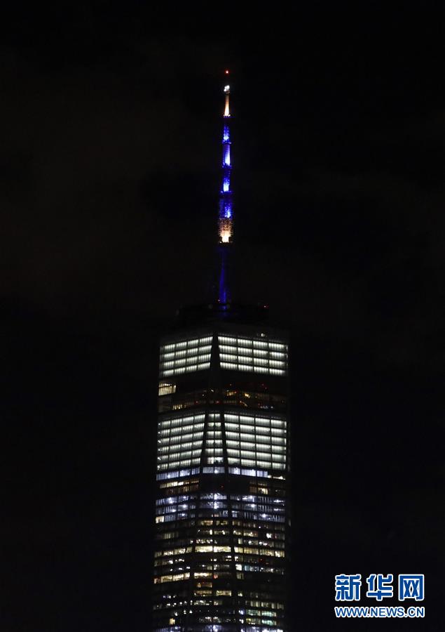 這是6月7日拍攝的點亮藍色和金色燈光的美國紐約世貿中心一號樓。新華社記者王迎攝
