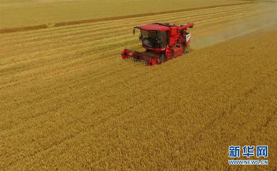 6月8日,聯(lián)合收割機(jī)在河北省南和縣閆里鄉(xiāng)閆里村麥田進(jìn)行夏收作業(yè)(無人機(jī)照片)?!叭摹逼陂g,河北省預(yù)計(jì)組織和調(diào)度小麥聯(lián)合收割機(jī)、拖拉機(jī)、夏玉米播種機(jī)等200萬臺(tái)農(nóng)業(yè)機(jī)械投入作業(yè)。新華社記者朱旭東攝