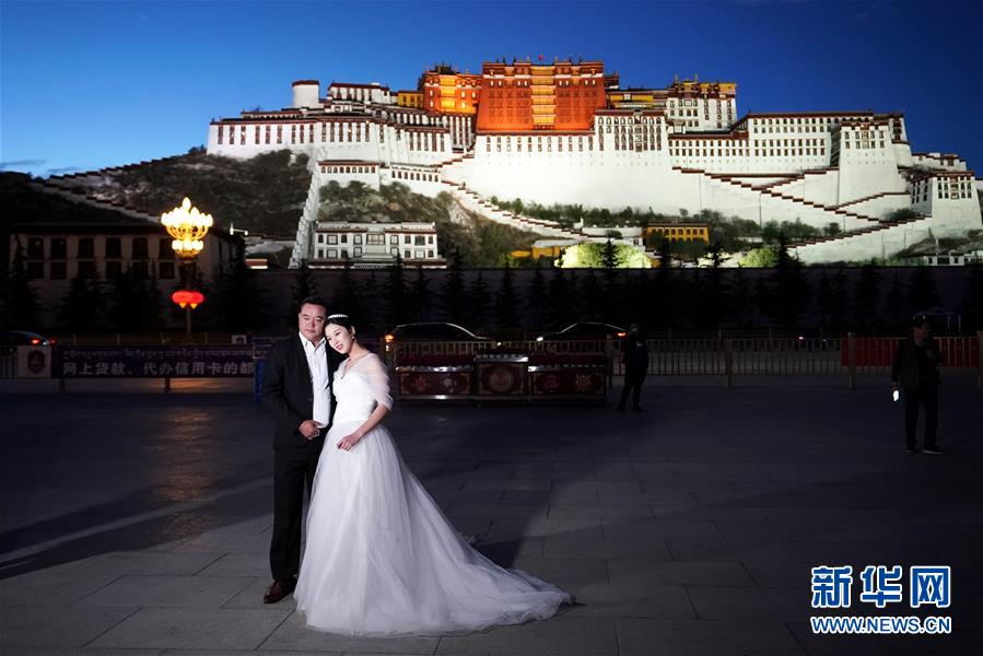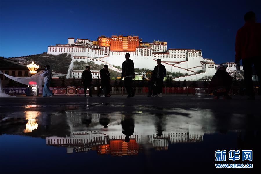 游客在布達拉宮廣場拍照(6月8日攝)。夜幕降臨,西藏拉薩布達拉宮燈光璀璨,夜景迷人。新華社記者詹彥攝