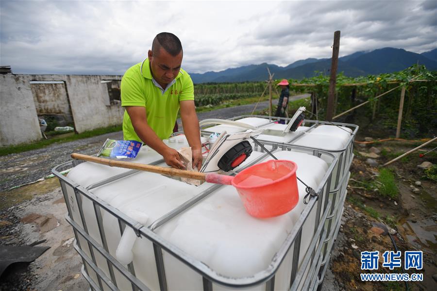 6月9日,在江華瑤族自治縣濤圩鎮(zhèn)鳳尾村蔬菜基地,農(nóng)戶在配制農(nóng)作物消毒水。近日,受連續(xù)強降雨影響,湖南省永州市江華瑤族自治縣遭遇洪澇災(zāi)害,部分農(nóng)田受災(zāi)。目前,江華瑤族自治縣洪水已退,群眾在當(dāng)?shù)叵嚓P(guān)部門引導(dǎo)下積極開展生產(chǎn)自救。新華社記者陳澤國攝