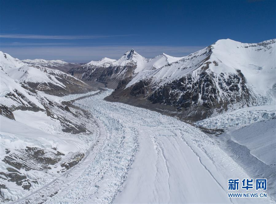 這是珠峰腳下的絨布冰川(無人機照片,5月10日攝)。從空中俯瞰珠穆朗瑪峰北坡,生機勃勃的高原濕地、蜿蜒曲折的盤山公路、壯麗秀美的絨布冰川,還有安靜的村莊和熱鬧的登山營地,共同構(gòu)成一幅壯美畫卷。新華社記者孫非攝