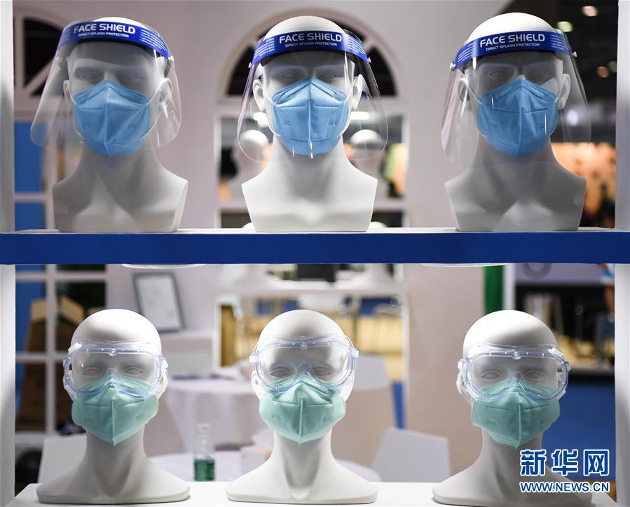 6月10日拍攝的展會上的口罩和防護(hù)罩產(chǎn)品。當(dāng)日,廣州國際防疫物資展覽會在保利世貿(mào)博覽館舉行。本次展會面積共計3.6萬平方米,設(shè)有防疫產(chǎn)品、設(shè)備、綜合服務(wù)、原輔料等4個展區(qū),參展企業(yè)約600家。新華社記者鄧華攝