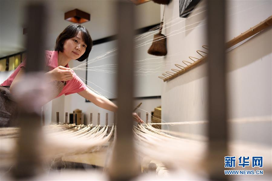 6月12日,在重慶榮昌的天運夏布會館,非遺傳承人馬琳沁在展示傳統(tǒng)夏布生產(chǎn)工藝——牽線。新華社記者 唐奕 攝