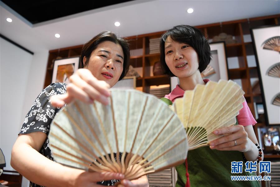 6月12日,非遺傳承人馬仁芬(左)與馬琳沁在探討夏布折扇的設計。新華社記者 唐奕 攝