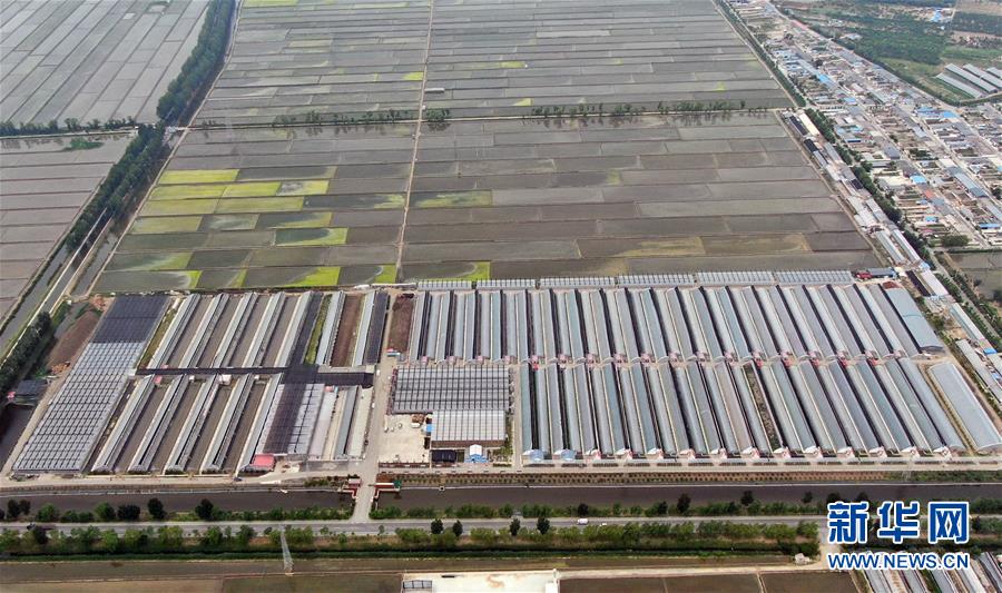 在遼寧省盤錦市大洼區(qū)新興鎮(zhèn)拍攝的劉廣會(huì)經(jīng)營(yíng)的現(xiàn)代化育苗大棚(6月9日攝,無(wú)人機(jī)照片)。新華社記者 楊青 攝