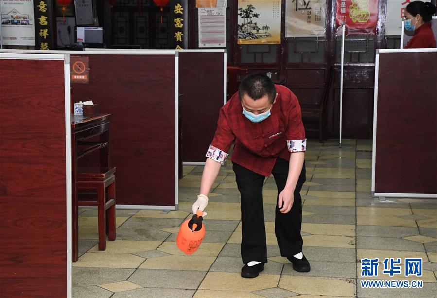 6月17日,在位于北京市海淀區(qū)的海碗居增光路店,工作人員對(duì)地面進(jìn)行消毒。新華社記者 任超 攝