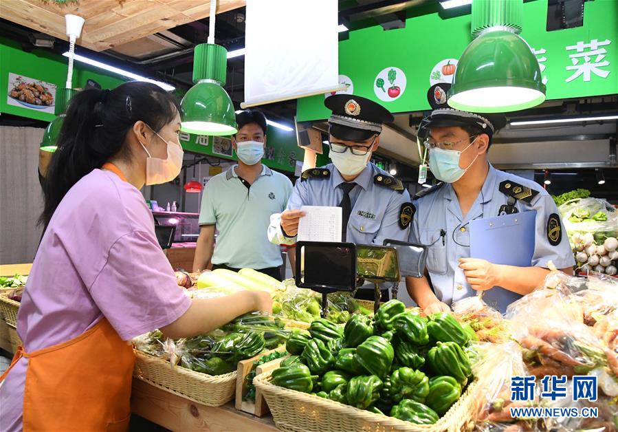 6月17日,在位于北京市海淀區(qū)的增光鴻運市場,執(zhí)法人員對商戶所售蔬菜的進(jìn)貨渠道進(jìn)行檢查。新華社記者 任超 攝