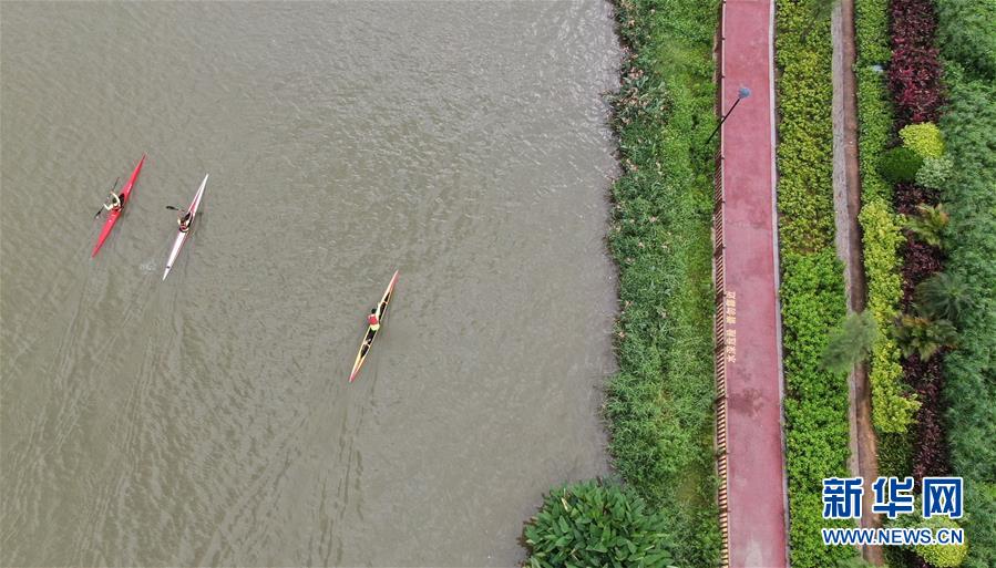 6月15日,劃艇運動員在茅洲河上訓(xùn)練(無人機照片)。新華社記者 鄧華 攝