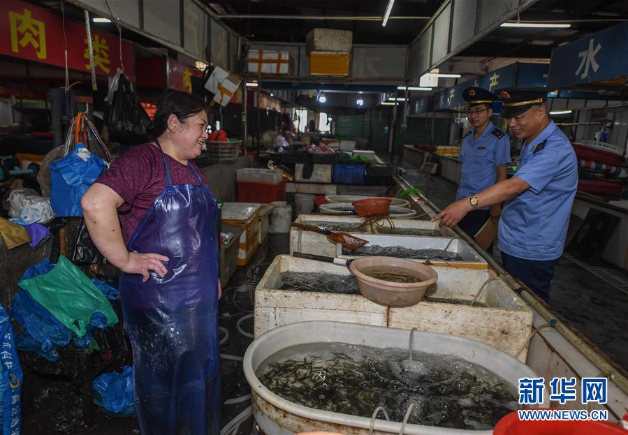 6月17日,市場監(jiān)管執(zhí)法人員在東林鎮(zhèn)農(nóng)貿(mào)市場開展專項(xiàng)執(zhí)法行動,檢查是否存在非法銷售野生動物的情況。新華社記者 徐昱 攝
