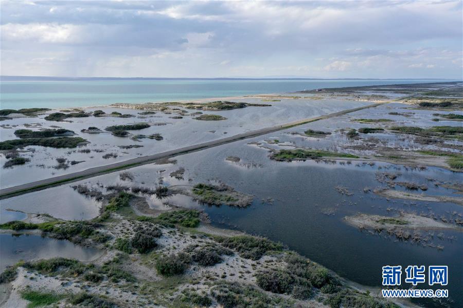 6月18日拍攝的新疆烏倫古湖國家濕地公園(無人機(jī)照片)。烏倫古湖國家濕地公園位于新疆阿勒泰地區(qū)福海縣城以西,由烏倫古湖和吉力湖兩部分組成。烏倫古湖濕地公園是遷徙候鳥飛越天山和阿爾泰山的“能量補(bǔ)充站”,良好的濕地生態(tài)吸引著大量遷徙鳥類在此集結(jié)成群,繁殖棲息,成為一道靚麗的風(fēng)景線。新華社記者 沙達(dá)提 攝