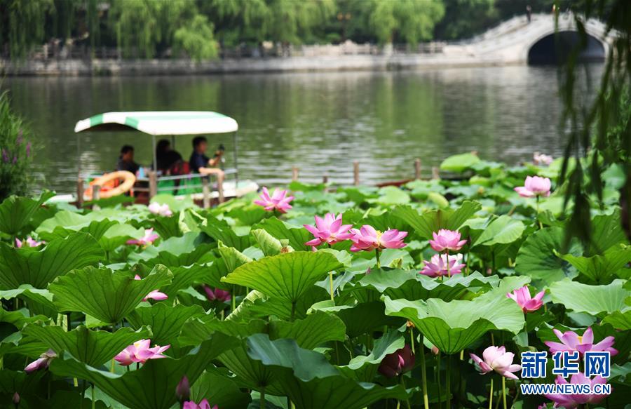 6月19日,市民泛舟在大明湖上。近日,山東濟南大明湖的荷花陸續(xù)綻放,吸引游客前來觀賞。新華社記者 王凱 攝