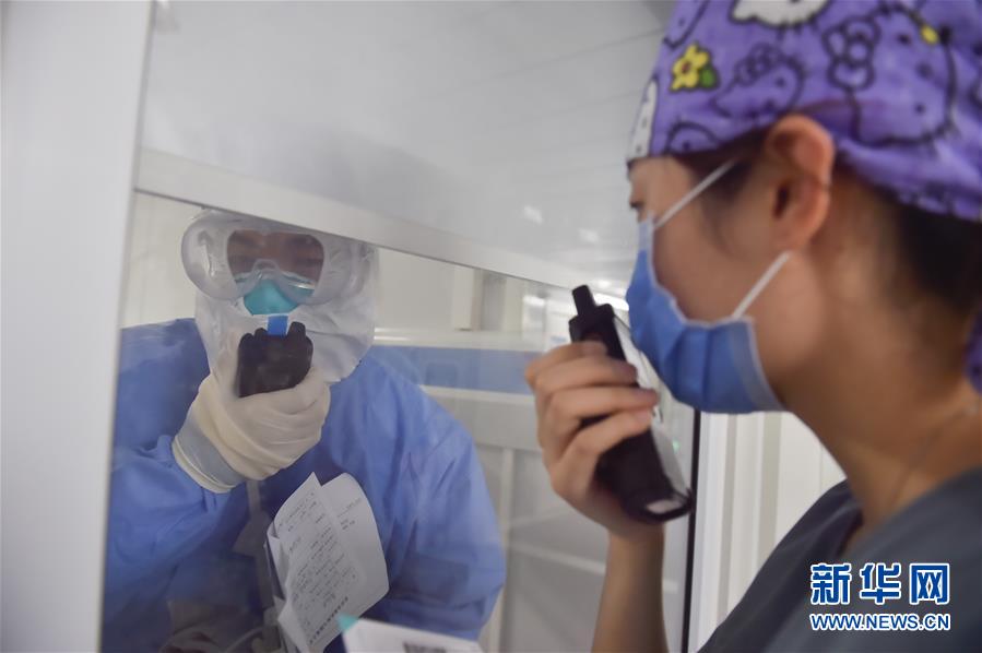 6月19日,在北京地壇醫(yī)院隔離病房內(nèi),護(hù)士正在用對講機(jī)和外面交流。新華社記者彭子洋攝