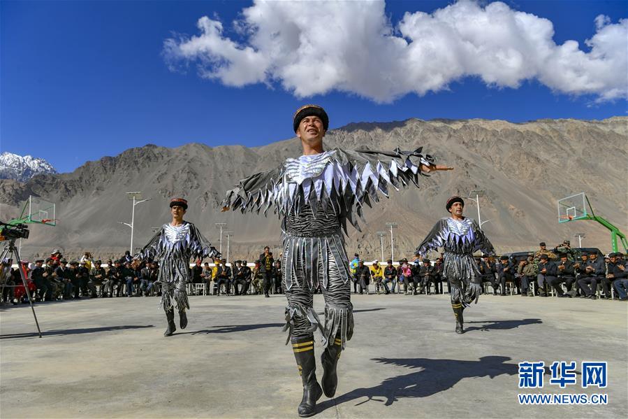 新疆塔什庫(kù)爾干塔吉克自治縣文工團(tuán)演員在熱斯喀木村表演塔吉克族鷹舞(6月6日攝)。新華社記者胡虎虎攝