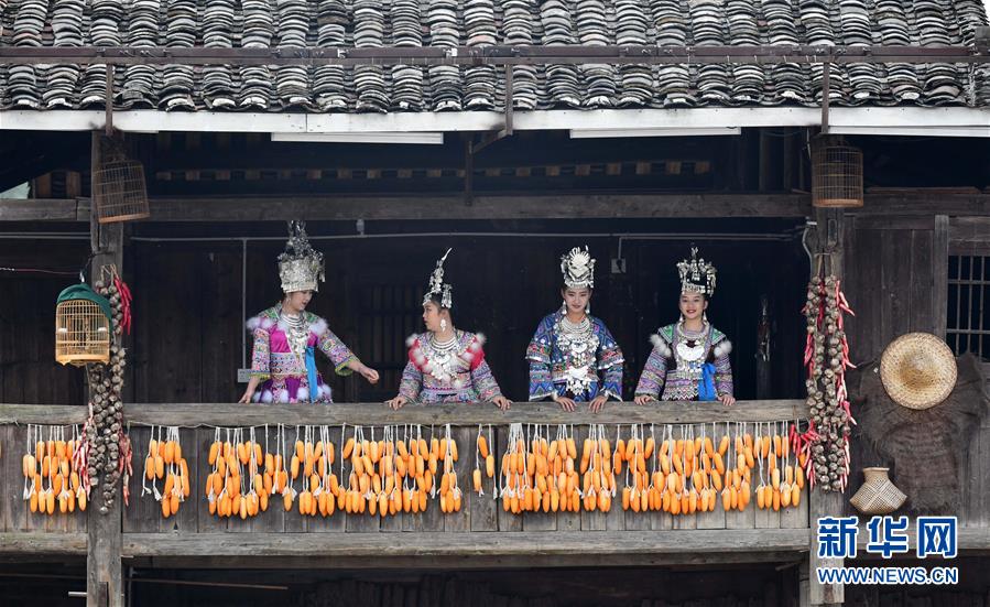 在廣西融水雙龍溝森林旅游度假區(qū)夢嗚苗寨,游客身著苗族服飾拍照(2019年11月24日攝)。近年來,融水打造原生態(tài)苗族文化體驗園——夢嗚苗寨,讓搬遷進城的貧困戶住進復(fù)原建設(shè)的老房子。景區(qū)提供綠化保潔、游樂設(shè)施管理、民族歌舞表演等工作崗位,多渠道增加貧困戶收入。新華社記者黃孝邦攝