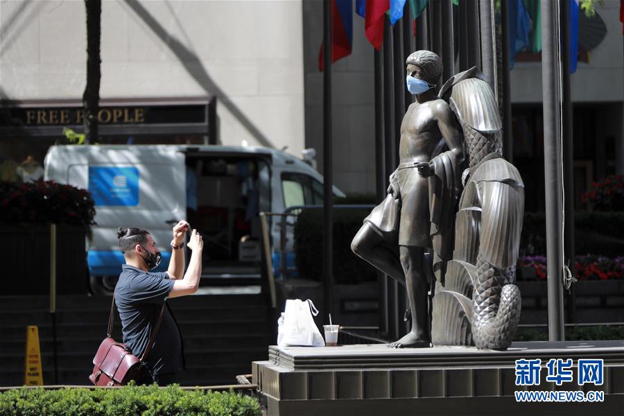 6月22日,在美國(guó)紐約洛克菲勒中心,一名男子拍攝“戴”口罩的雕像。美國(guó)約翰斯·霍普金斯大學(xué)22日發(fā)布的新冠疫情最新統(tǒng)計(jì)數(shù)據(jù)顯示,美國(guó)累計(jì)死亡病例超過(guò)12萬(wàn)例。新華社記者王迎攝