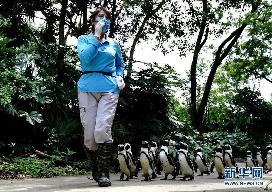 6月26日,上海動(dòng)物園飼養(yǎng)員引導(dǎo)企鵝在園內(nèi)漫步。端午小長(zhǎng)假第二天,上海動(dòng)物園開(kāi)展“企鵝漫步科普行”活動(dòng),受到游客歡迎。新華社記者 張建松 攝