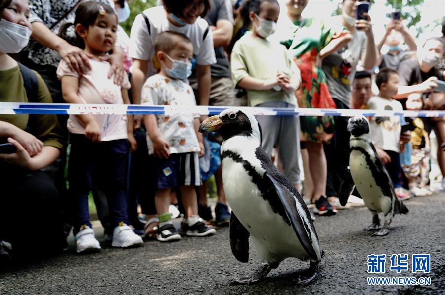 6月26日,上海動(dòng)物園的企鵝在游客面前漫步。新華社記者 張建松 攝
