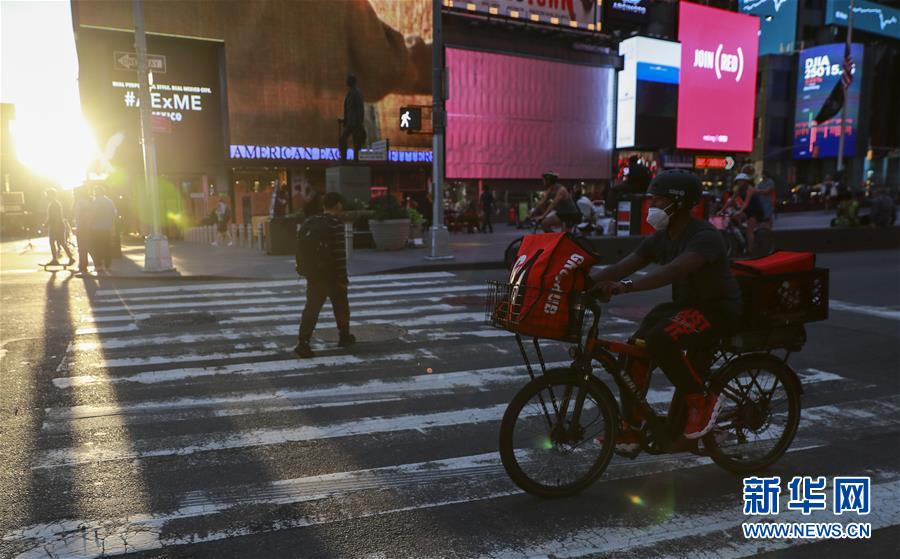 6月27日,一名送貨員騎車經(jīng)過美國紐約時報廣場。美國約翰斯·霍普金斯大學(xué)27日發(fā)布的新冠疫情最新統(tǒng)計(jì)數(shù)據(jù)顯示,截至美國東部時間27日16時35分(北京時間28日4時35分),美國累計(jì)新冠確診病例2500419例,累計(jì)死亡病例125434例。新華社記者王迎攝