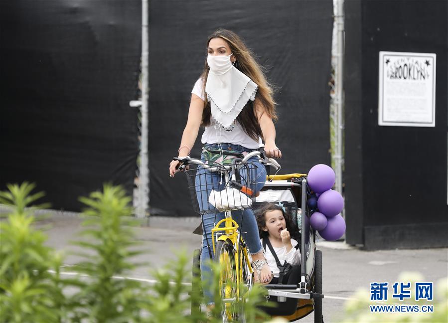 6月27日,一名女士在美國紐約多米諾公園內(nèi)騎車帶孩子游玩。美國約翰斯·霍普金斯大學(xué)27日發(fā)布的新冠疫情最新統(tǒng)計(jì)數(shù)據(jù)顯示,截至美國東部時間27日16時35分(北京時間28日4時35分),美國累計(jì)新冠確診病例2500419例,累計(jì)死亡病例125434例。新華社記者王迎攝