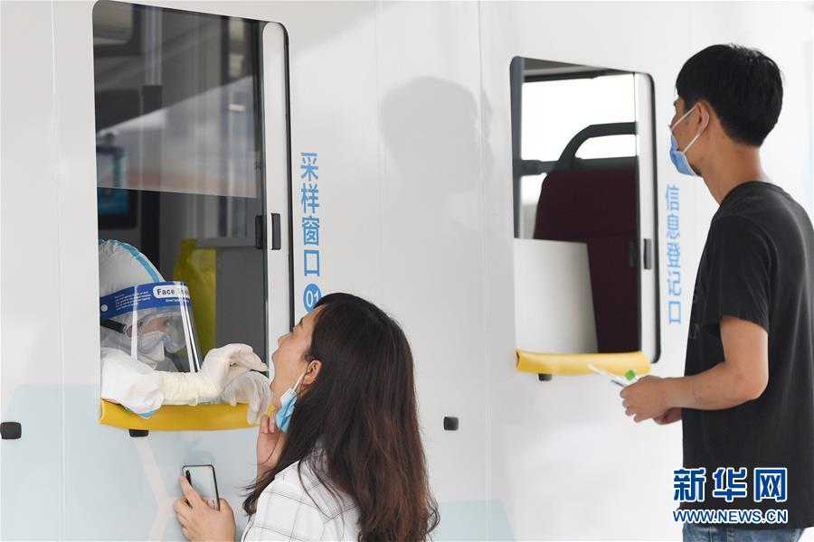 6月28日,在北京市西城區(qū)北京展覽館南側(cè)的露天廣場(chǎng)核酸檢測(cè)采樣點(diǎn),核酸檢測(cè)采樣車內(nèi)的醫(yī)護(hù)人員為前來(lái)做檢測(cè)的人員進(jìn)行采樣。新華社記者鞠煥宗攝