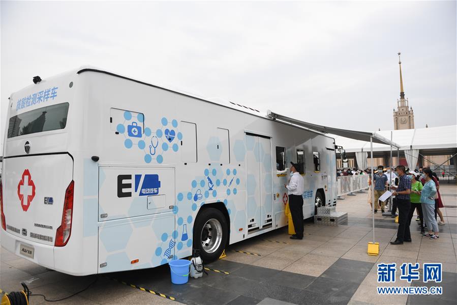 6月28日,在北京市西城區(qū)北京展覽館南側(cè)的露天廣場(chǎng)核酸檢測(cè)采樣點(diǎn),前來(lái)做檢測(cè)的人員在核酸檢測(cè)采樣車旁排隊(duì)。新華社記者鞠煥宗攝