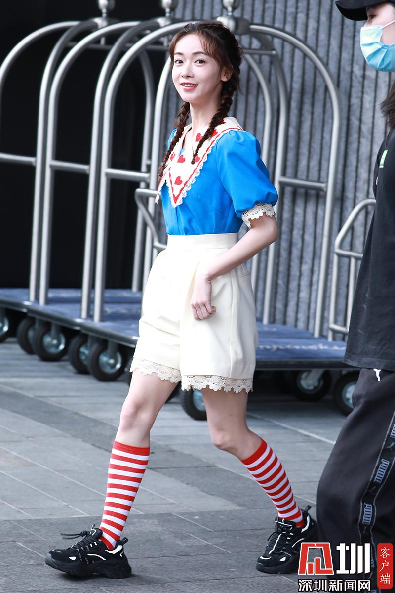 吳謹(jǐn)言身穿藍(lán)色上衣搭配白裙秀美腿,少女感十足。