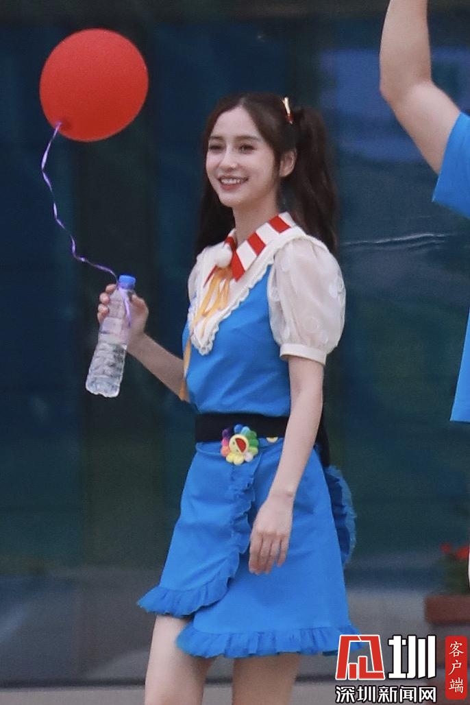 楊穎(angelababy)穿藍(lán)色背帶裙扎雙馬尾清新可愛