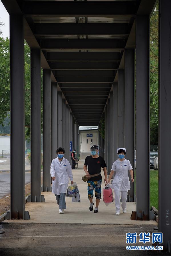 6月29日,在北京地壇醫(yī)院內(nèi),醫(yī)護人員送患者何先生離開隔離病區(qū)。新華社記者彭子洋攝