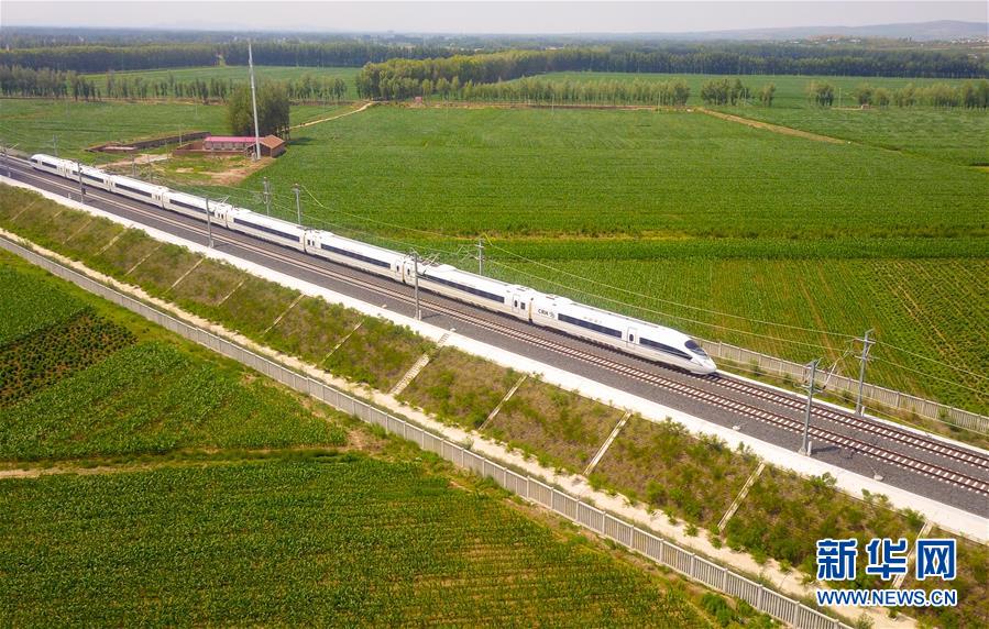 一列“和諧號(hào)”動(dòng)車(chē)組列車(chē)行駛在內(nèi)蒙古赤峰市元寶山區(qū)的田野間(6月30日攝,無(wú)人機(jī)照片)。新華社記者彭源攝
