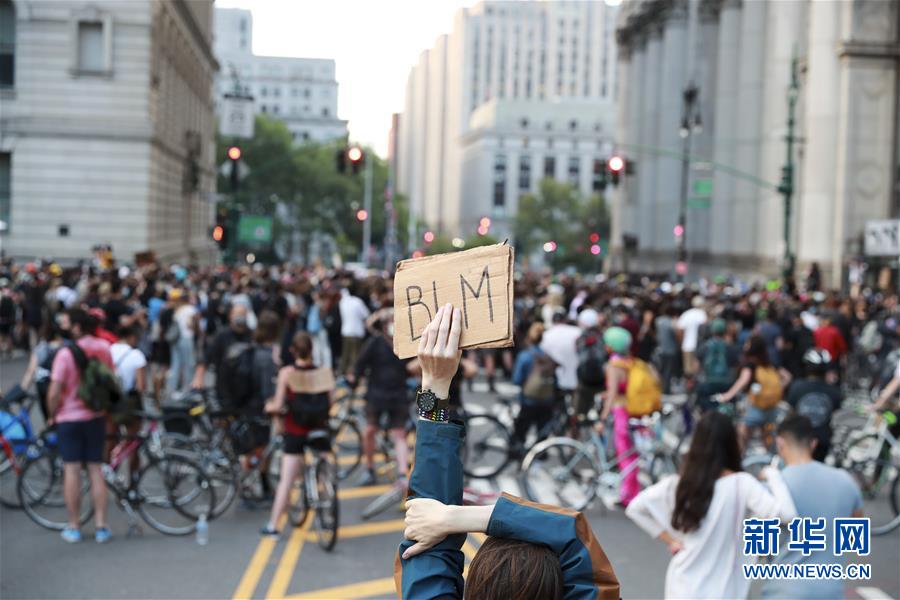 6月30日,一名抗議者在美國(guó)紐約市政廳附近手舉寫有“黑人的命也是命”縮寫的標(biāo)語(yǔ)參加抗議活動(dòng)。由美國(guó)明尼蘇達(dá)州明尼阿波利斯市非裔男子弗洛伊德遭白人警察暴力執(zhí)法而死一事引發(fā)的各種抗議活動(dòng)仍在紐約持續(xù)進(jìn)行。新華社記者王迎攝