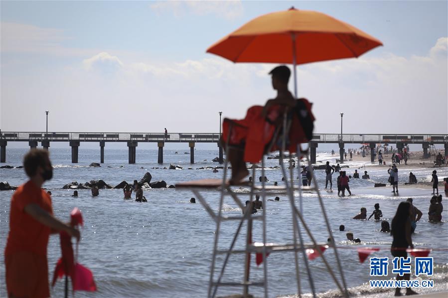 7月1日,人們?cè)诿绹?guó)紐約科尼島戲水。當(dāng)日,美國(guó)紐約市屬八處海灘正式重新準(zhǔn)許民眾游泳,救生員也同時(shí)上崗。新華社記者王迎攝