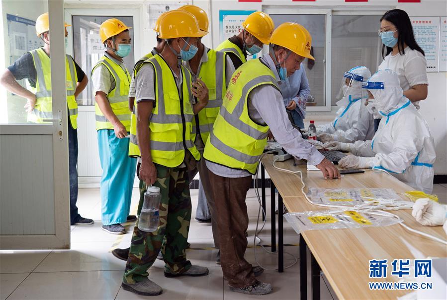 7月2日,在北京市大興區(qū)中建三局二公司北京公司一項(xiàng)目建筑工地的臨時(shí)核酸檢測(cè)采樣點(diǎn),醫(yī)護(hù)人員為建筑工地人員采集咽拭子。新華社記者才揚(yáng)攝
