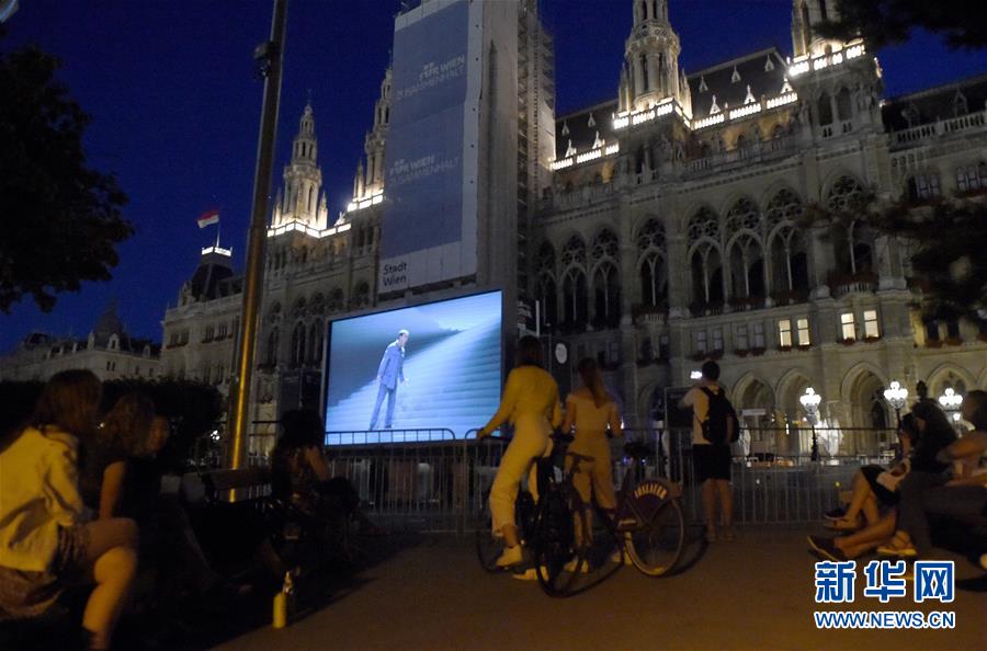 7月4日,觀(guān)眾們?cè)趭W地利首都維也納市政廳廣場(chǎng)外場(chǎng)區(qū)域觀(guān)看維也納電影節(jié)開(kāi)幕電影——貝多芬的歌劇《菲岱利奧》。新華社記者郭晨攝
