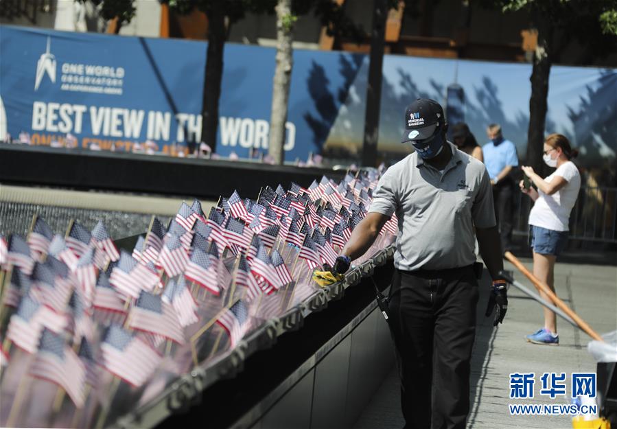 7月4日,工作人員在當日重新開放的美國紐約“9·11”世貿(mào)中心遺址做清潔。當日是美國獨立日,美國多地疫情仍面臨嚴峻形勢。美國約翰斯·霍普金斯大學實時統(tǒng)計數(shù)據(jù)顯示,美國累計新冠確診病例4日已超過280萬例。新華社記者王迎攝