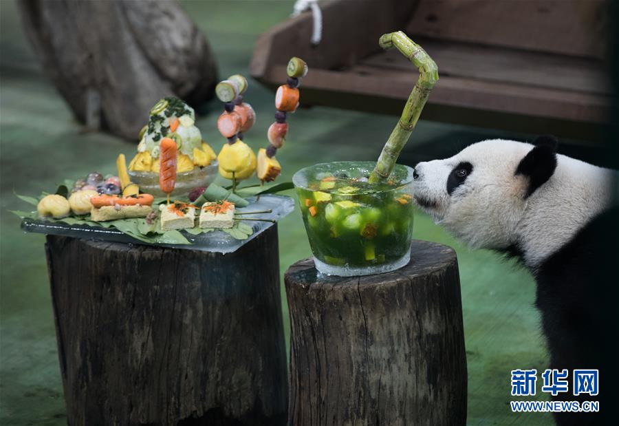 7月6日,在臺(tái)北市立動(dòng)物園,大熊貓“圓仔”正在品嘗特制的生日蛋糕。新華社記者金立旺攝