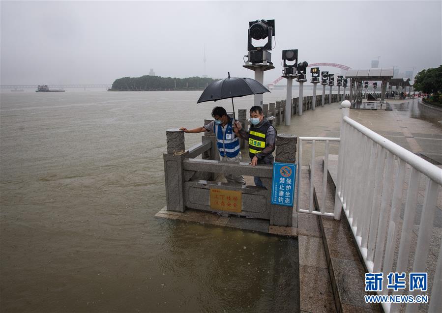 7月6日,工作人員在武漢龍王廟觀察水情。記者6日從武漢市防汛抗旱指揮部辦公室獲悉,5日以來,武漢遭暴雨襲擊,全市多處路段漬水。至6日4時,長江漢口站超設防水位1.79米,漢江新溝站超警戒水位0.01米。鑒于當前水雨汛情和漬澇情況,武漢市從6日5時起,將排澇應急響應級別提升至Ⅱ級;從6時30分起,將防汛應急響應級別提升至Ⅱ級。新華社記者肖藝九攝