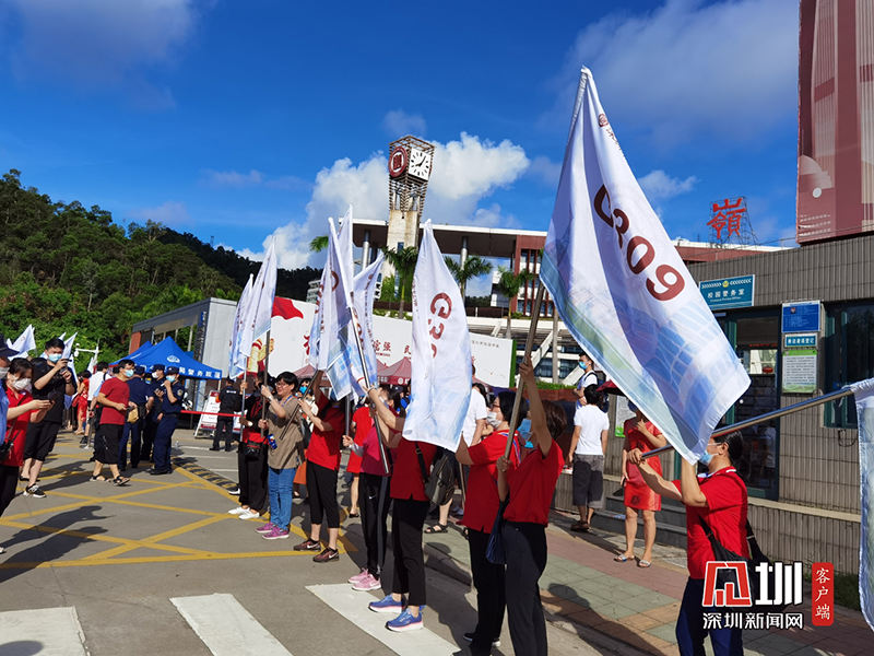 深圳紅嶺中學(xué)高三各班級(jí)家長(zhǎng)代表組成的家長(zhǎng)委員會(huì),在門口為高三考生助威加油。