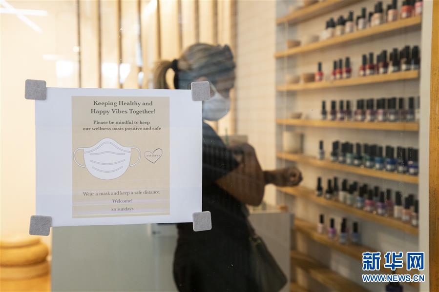 7月6日,顧客在美國(guó)紐約一家美甲店挑選指甲油,店門上貼著佩戴口罩進(jìn)店的提示。當(dāng)天,紐約進(jìn)入重啟第三階段,美甲店、按摩店等個(gè)人護(hù)理業(yè)在經(jīng)歷近4個(gè)月的停業(yè)后被允許重新開放。因防疫需要,原本應(yīng)在第三階段開放的餐飲業(yè)室內(nèi)就餐仍處于暫停狀態(tài)。新華社記者王迎攝