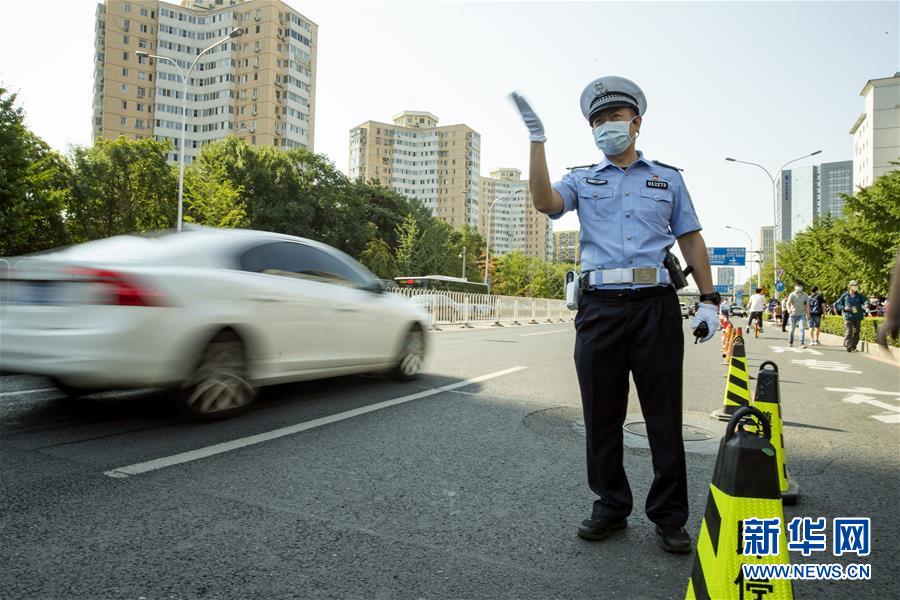 7月7日,在位于北京的中國(guó)人民大學(xué)附屬中學(xué)考點(diǎn)外,北京市公安局公安交通管理局海淀交通支隊(duì)中關(guān)村大隊(duì)交警付云輝在指揮車(chē)輛有序行駛。當(dāng)日,2020年高考拉開(kāi)帷幕。新華社記者沈伯韓攝