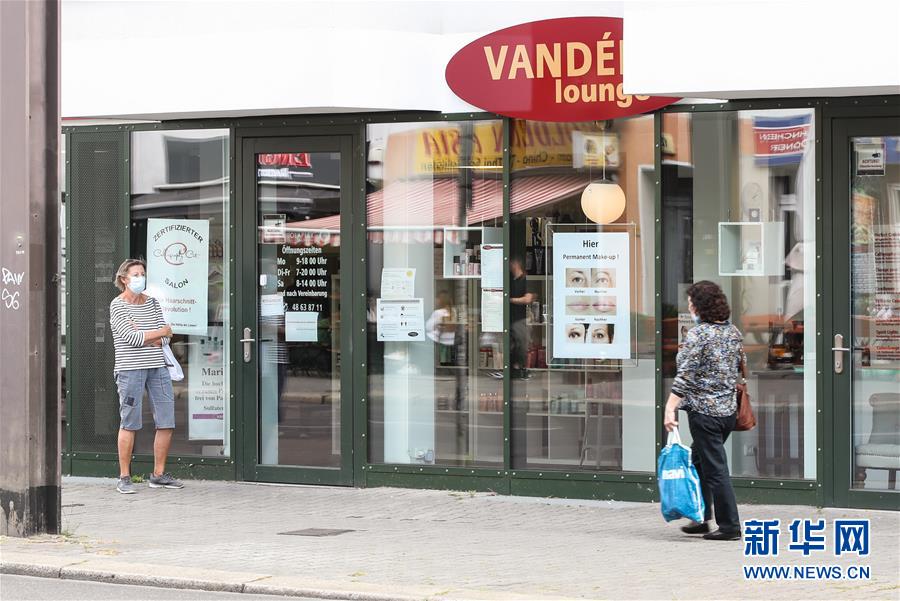 7月7日,一名佩戴口罩的女子(左)等待進(jìn)入德國首都柏林的一家理發(fā)店。針對有地方官員呼吁取消民眾乘坐公交車和在商場購物時須戴口罩的規(guī)定,德國聯(lián)邦政府6日表示,支持延續(xù)“口罩強制令”。4月底,德國全部16個聯(lián)邦州陸續(xù)出臺“口罩強制令”,即居民在乘坐公交車和購物時須佩戴口罩。新華社記者單宇琦攝