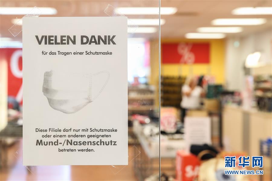 這是7月7日在德國首都柏林拍攝的一家店鋪在待售口罩旁懸掛著提示顧客佩戴口罩的告示。針對有地方官員呼吁取消民眾乘坐公交車和在商場購物時須戴口罩的規(guī)定,德國聯(lián)邦政府6日表示,支持延續(xù)“口罩強制令”。4月底,德國全部16個聯(lián)邦州陸續(xù)出臺“口罩強制令”,即居民在乘坐公交車和購物時須佩戴口罩。新華社記者單宇琦攝